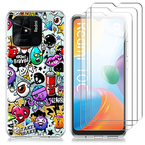 Cover per Xiaomi Redmi 10C / Poco C40 con 3 Vetro Temperato Pellicola Protettiva, Graffiti Colorati Morbido TPU Protettiva Custodia per Xiaomi Redmi 10C / Poco C40 6,71''