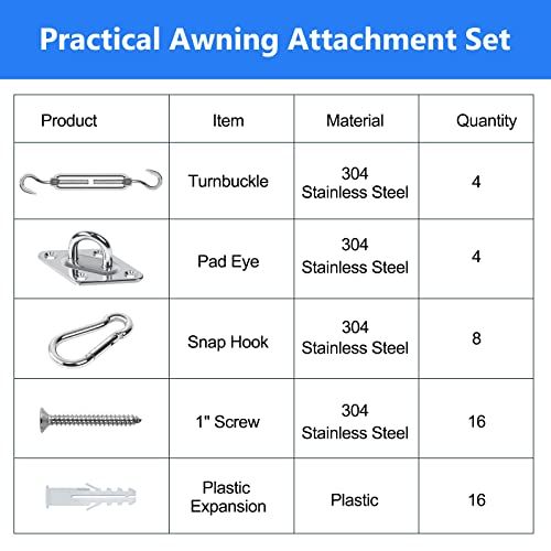 Kit di installazione per tenda parasole: Contiene 4 ganci a molla M5, 8 tenditori M5, 4 staffe a parete, 16 viti, 16 tappi in plastica, il kit di accessori per il fissaggio parasole regolabile garantisce una tensione sufficiente.