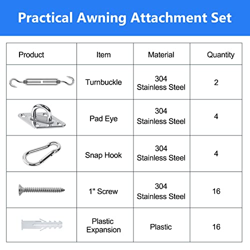 Progettato per durata e affidabilità- Il robusto kit per tende parasole è realizzato in acciaio inossidabile 304 di alta qualità, prodotto in stretta conformità con gli standard ASTM americani, sono resistenti agli agenti atmosferici e alla ruggine, robusti, non arrugginiscono facilmente.