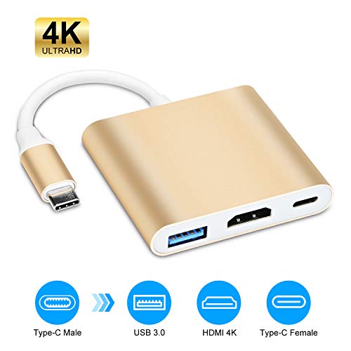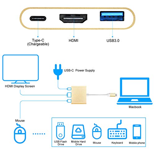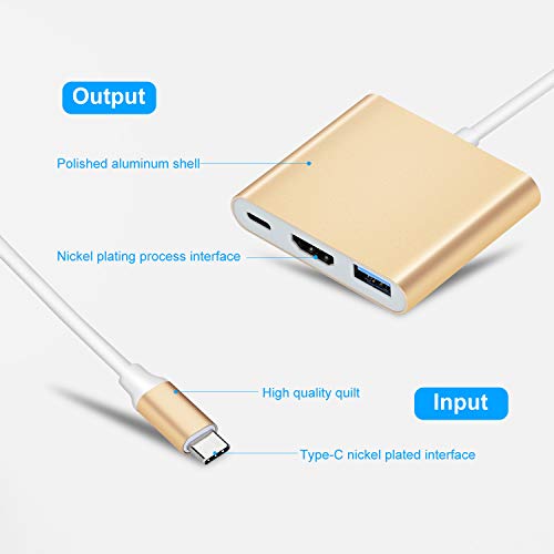 【Adattatore 3 in 1 da USB C a HDMI】 Design compatto Adattatore multiporta da USB tipo C a HDMI / USB-C / USB 3.0 di piccole dimensioni facile da trasportare in tasca. L'adattatore è realizzato in guscio di alluminio per fornire una migliore rigidità e dissipazione del calore, che fornisce migliori prestazioni del segnale. Questo adattatore è molto adatto per l'ufficio o l'intrattenimento.