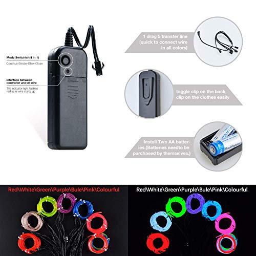 EL Wire - Lunghezza del filo elettroluminescente: 5*1m. Diametro del filo elettroluminescente: 2,3 mm. Alimentato da 2 x batterie AA (non incluse).