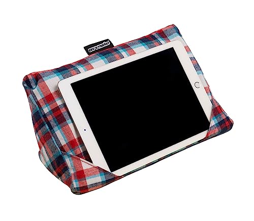 Coz-e-reader, cuscino I-Pad, cuscino per tablet in tessuto a quadretti rosso e navy. 3 posizioni di visualizzazione per il tuo dispositivo