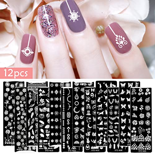 Cozlly 12pcs Nail Template Piastra per Unghie,Set di Nail Art Stamping con raschietto e timbro,Stampi per unghie con vari motivi,Strumenti per nail art,Adatti per nail art fai da te