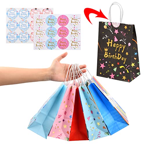 Cozlly 12 Pezzi Kraft Sacchetti Regalo Compleanno con adesivi, Sacchetti Carta con Manici, Sacchettini Compleanno Bambini, Buste Regalo, Regalo da Festa Borse di Carta, per Bambini Feste di Compleanno