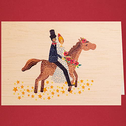 Cozywood - Biglietto di auguri, in legno, biglietto di invito per matrimonio, biglietto di auguri per regali in denaro, motivo: sposi su cavallo