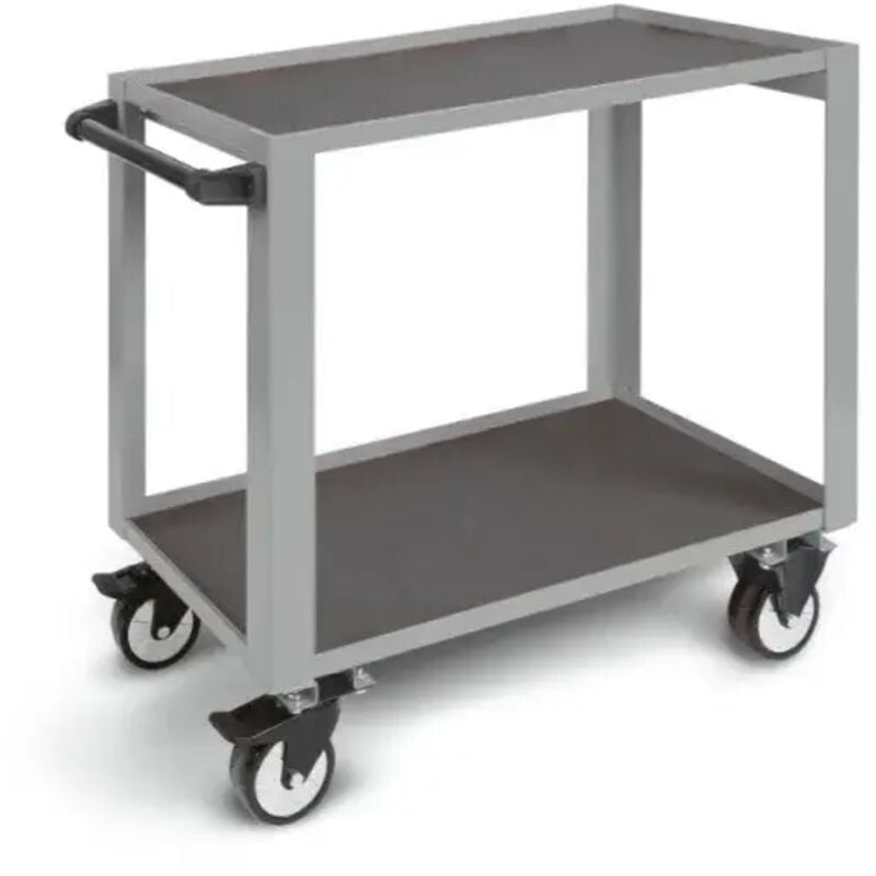• 2 ripiani ricoperti da tappetini in gomma • Maniglia ergonomica • Quattro ruote Ø 125 mm ad alta resistenza: 2 fisse e 2 girevoli (una con freno). • Capacità di carico statico: 750 kg. (distribuita sui 2 ripiani) 37 kg