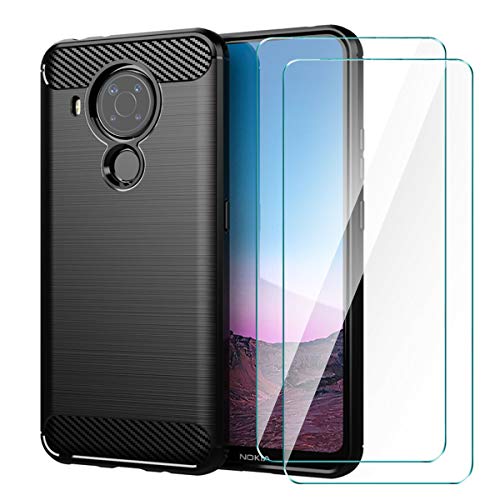 CQiuLi Cover per Nokia 5.4 + 2 Pezzi Vetro Temperato, Flessibile Soft TPU Spazzolato Custodia in TPU Morbido Fibra di Carbonio, Cover Protezione Anti Scivolo/Antiurto - Nero