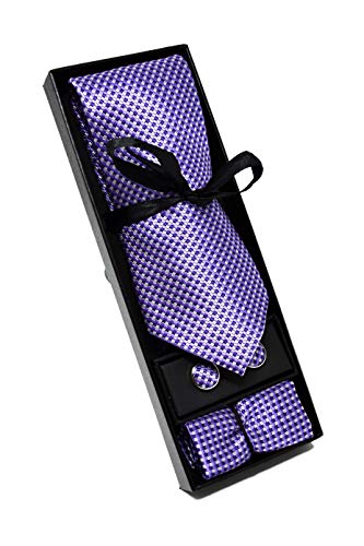 Cravatta da uomo, Fazzoletto da Taschino e Gemelli Viola a Righe - 100% seta - Classico, Elegante e Moderno - (Confezione Regalo, ideale per un matrimonio, con un abito, in ufficio...)
