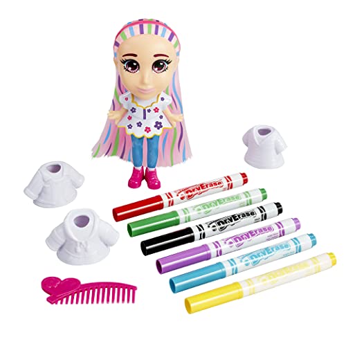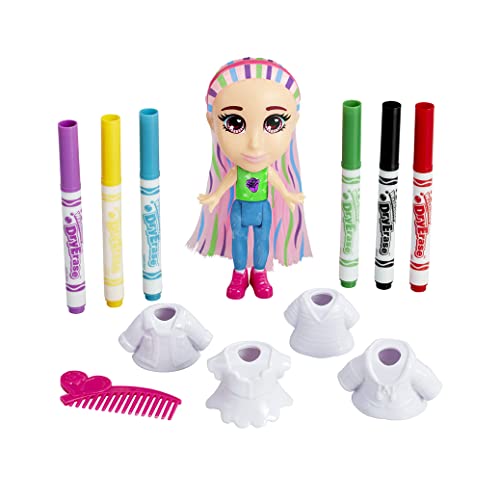 Rosa ama i colori dell'arcobaleno. Tinge i capelli in tutti i colori e le rende un trucco folle. Include 1 bambola, 4 vestiti a clip, 6 pennarelli cancellabili a secco e 1 pettine per lo styling dei capelli di rosa.