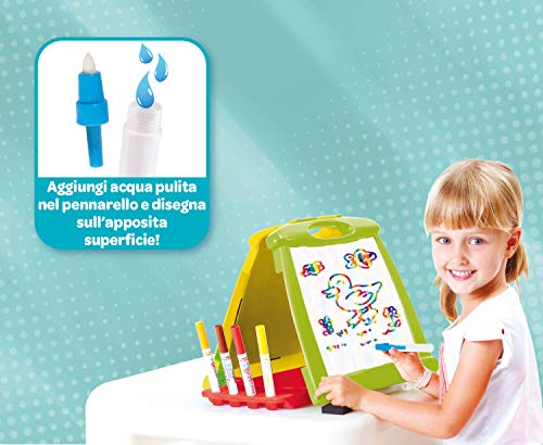 da un lato lavagna magica che si attiva con l'acqua e rivela uno sfondo multicolore e dall'altra lavagna bianca da utilizzare con gli appositi pennarelli
