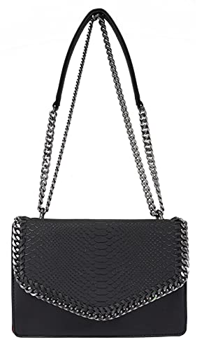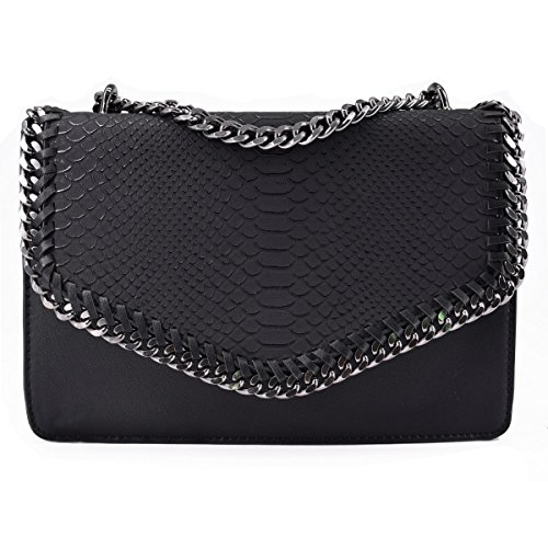 MATERIALE & DETTAGLI: Cuoio sintetico PU, patta strutturata effetto serpente pitone. Elementi metallici neri. Catene con taglio a diamante (lucidati piatti) per la massima lucentezza.