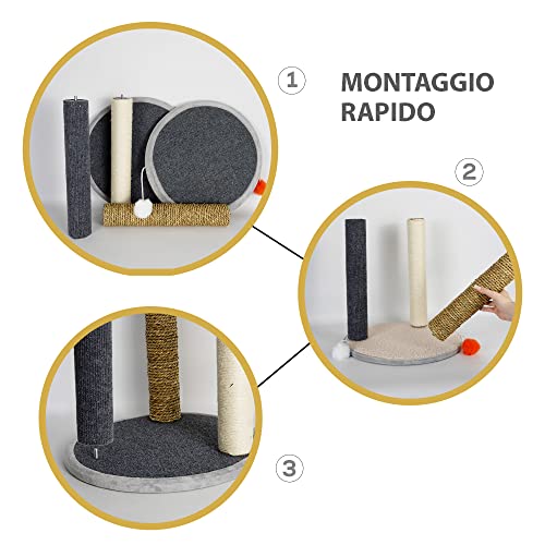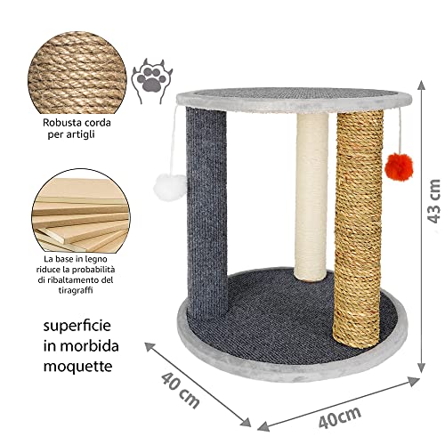 TIRAGRAFFI CON 3 PALI GRAFFIABILI E PALLINE: Il tiragraffi è dotato di 3 pali graffiabili, solidi e resistenti, che permettono al gatto di appoggiarsi e stiracchiarsi mentre li graffia. Le pallina stimolano la curiosità nel gatto. Design semplice ma funzionale