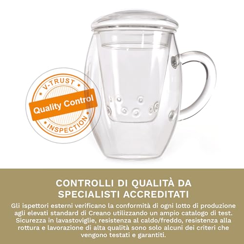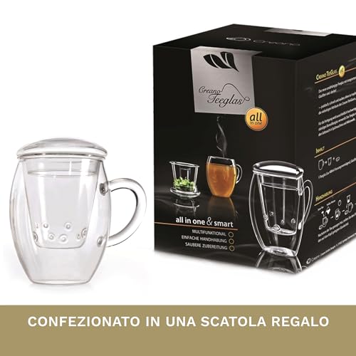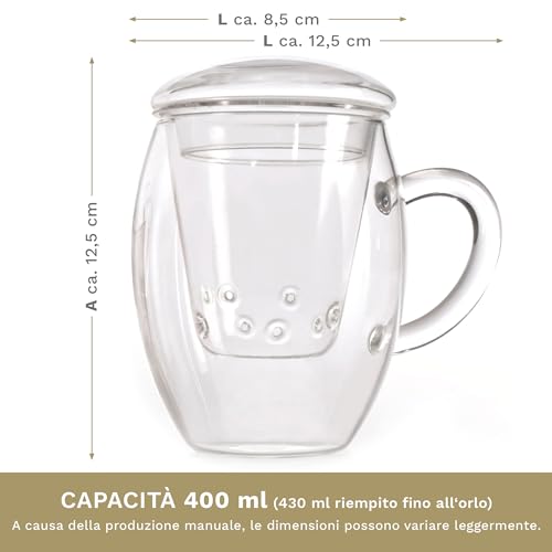 OFFERTA: 1 bicchiere da tè da 400 ml con manico, filtro e coperchio in vetro borosilicato trasparente di alta qualità, che mantiene le bevande calde un po' più a lungo. Il bicchiere da tè all-in-one è fatto per gustare tutti i tipi di tè di alta qualità come tè sfuso, tè alla frutta, tè verde, tè nero e bustine di tè.