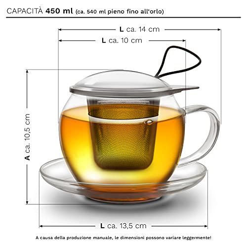Creano Tazza da tè XXL con manico jumbo con colino integrato in acciaio inossidabile, coperchio e piattino in set con 2 'Erblühtee'lini, 450 ml Set trasparente da 3 pezzi