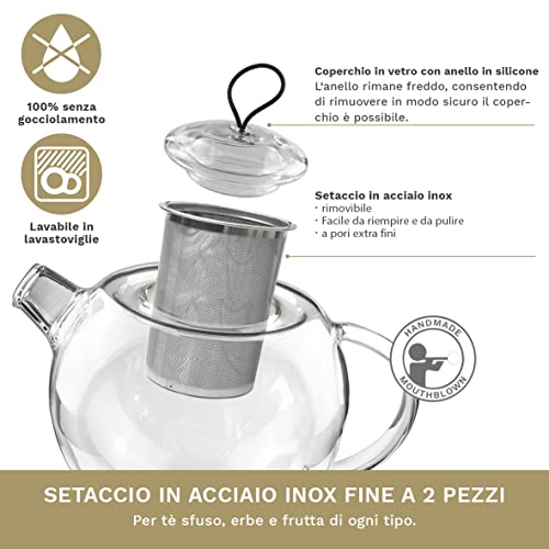 OFFERTA: La teiera in vetro con coperchio e colino in acciaio inox dal design senza tempo ha una capacità di 1000 ml, che corrisponde a circa 4-5 tazze. La teiera è ideale per preparare tè sfuso, tisane, tè alla frutta, bustine di tè, fiori di tè, ma anche caffè, tè freddo, succhi e spritz. Include uno scalda teiera in acciaio inox adatto a mantenere calde teiere, caffettiere e tazze.