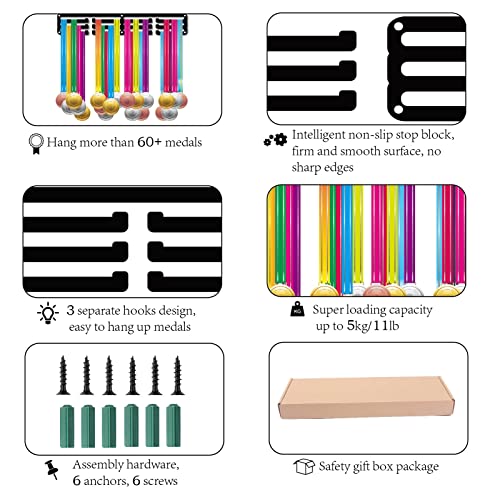 CONTENERE PI DI 60 MEDAGLIE: il porta medaglie è realizzato in ferro di alta qualità, 3 file e 12 supporti separati, capacità di carico eccellente fino a 5kg/11lb, appendi più di 60 medaglie, blocco di arresto antiscivolo intelligente, superficie solida e liscia, senza spigoli vivi.