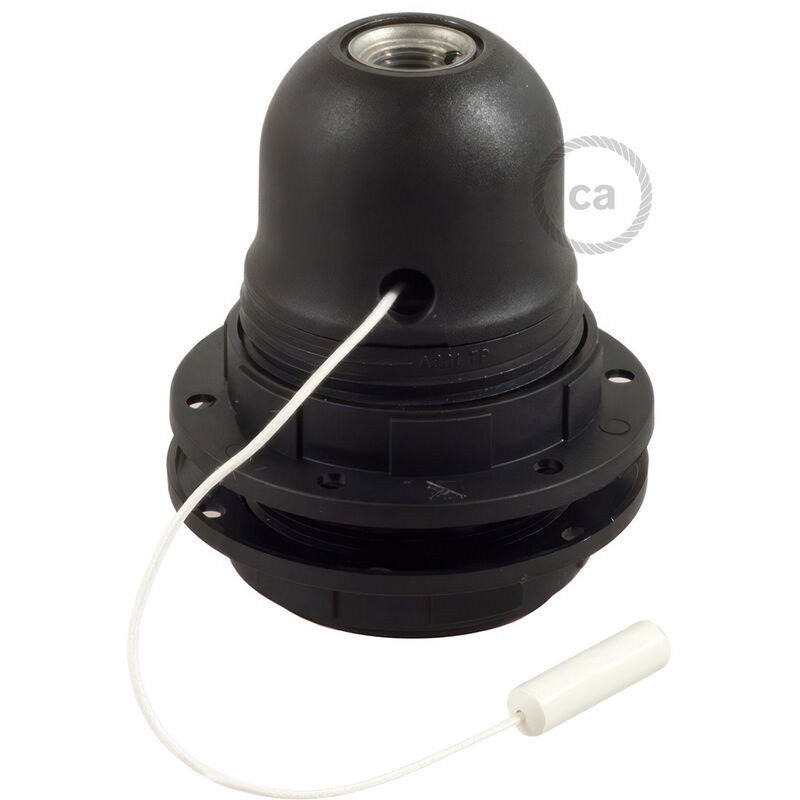 Il kit portalampada E27 in termoplastica con doppia ghiera e interruttore a tirante serve ad assemblare una lampada da parete, da tavolo o da soffitto dotata di paralume. La bachelite (o bakelite) è una resina termoindurente che prende il nome dal suo inventore ed evoca immediatamente telefoni, radio e oggetti d'uso comune negli anni ‘50 e ‘60. È un materiale leggero, resistente e, se verniciato, molto lucido! La presenza dell'interruttore a tirante consente di accendere o spegnere la lampadina ed è utile nei casi in cui manchi un interruttore a parete o infracavo. Il kit portalampada E27 in termoplastica con doppia ghiera per paralume e interruttore a tirante fa per te se: - intendi utilizzare un elemento schermante - desideri un portalampada semplice che valorizzi e lasci ben visibile la tua lampadina - non disponi di un interruttore a parete o infracavo. Per configurare e completare il kit portalampada E27 in termoplastica con doppia ghiera per paralume e interruttore a tirante