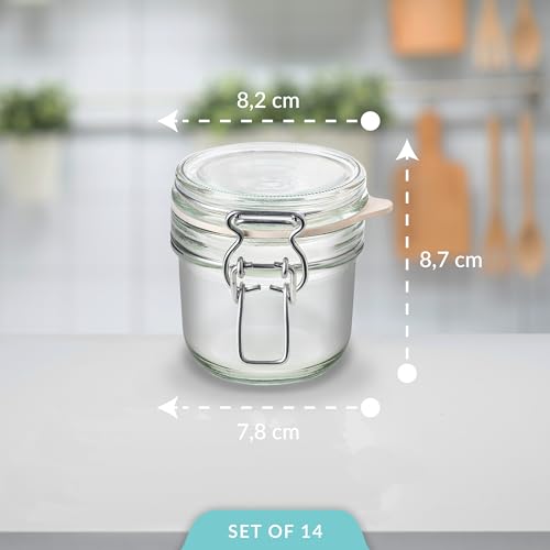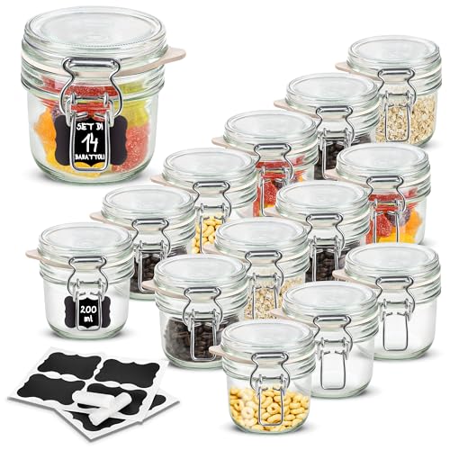 Creative Home 14x Barattoli Vetro Ermetici | 14x200ML | Set Vasetti Contenitori per Alimenti con Coperchio e Chiusura a Clip | Porta Confetti per Sale Zucchero caffè Biscotti | Vintage + 16 Etichette