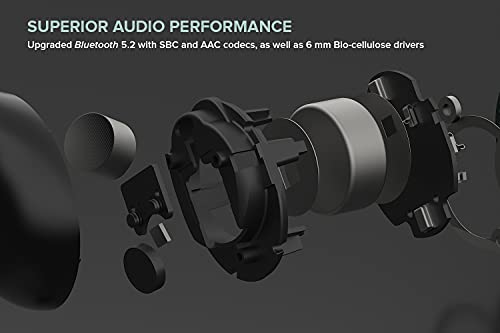 Bluetooth 5.2 con driver in Biocellulosa da 6mm. Driver migliorati, insieme ai codec audio AAC e SBC, per un'eccellente riproduzione audio, alti dettagliati, medi ben bilanciati, bassi coinvolgenti.