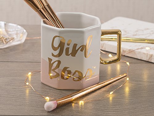 La tazza ha un design audace: unico manico ottagonale Shaping e un quadrato di stile con morbida rosa pastello e un slogan "Girl Boss in audace dettaglio in oro