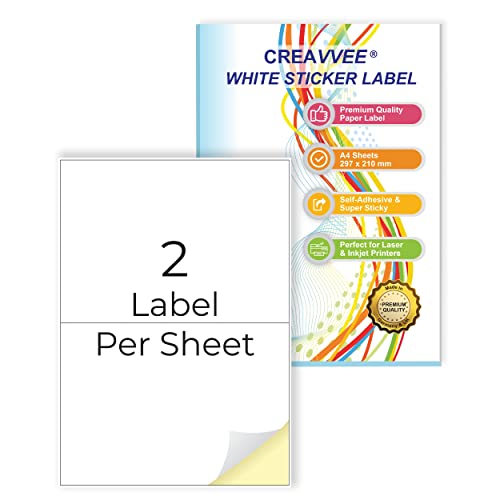 Creavvee 2 etichette per foglio, 25 fogli A4, stampabili in carta bianca adesiva per stampanti laser/a getto d'inchiostro, made in Europe - Formato adesivo (A5) 210 x 148 mm (2012)