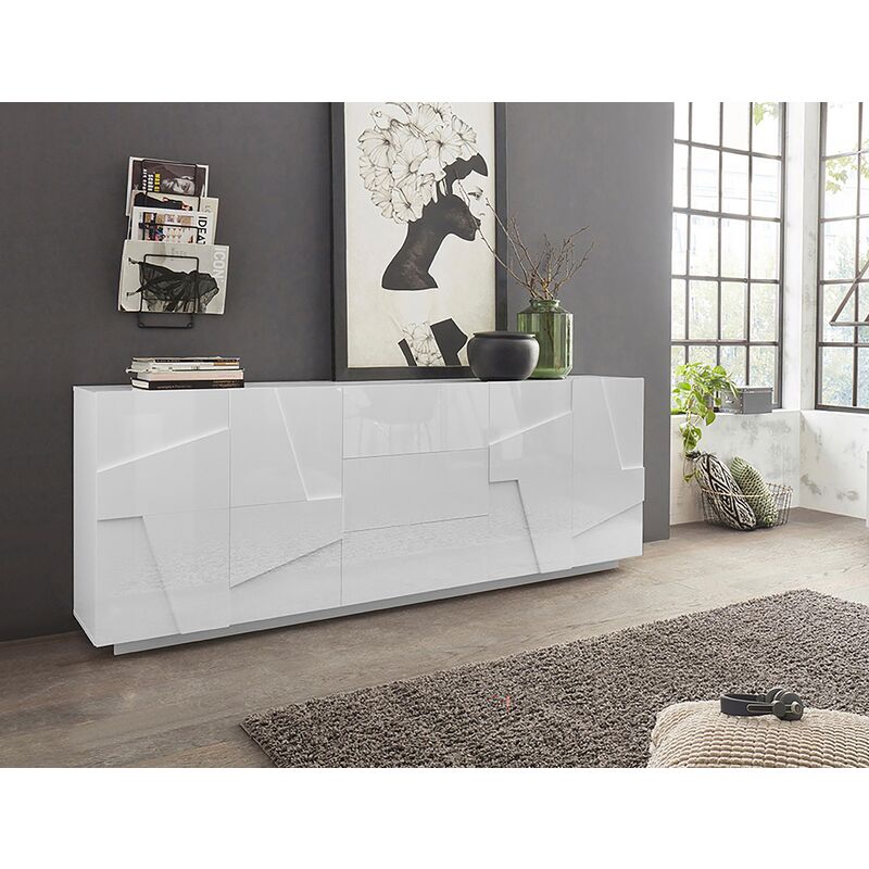 La credenza 4 ante 3 cassetti da 220 cm PING è una soluzione utile sia in soggiorno sia in sala da pranzo. Grazie ai molteplici spazi offerti si rivela un mobile pratico e capiente di design originale ed elevata funzionalità 100% made in Italy. La credenza PING è costituita da quattro ante a battente rese particolari dall'intaglio geometrico in rilievo sulla superficie che rendono la credenza del tutto moderna e di tre cassetti con apertura push to open . Al suo interno ci sono 2 ripiani in legno che garantiscono ampio spazio di utilizzo e di archiviazione. La struttura e le ante e cassetti sono realizzate in melaminico bianco laccato lucido, viene fornito in kit di montaggio e dotato di istruzioni semplici e dettagliate.