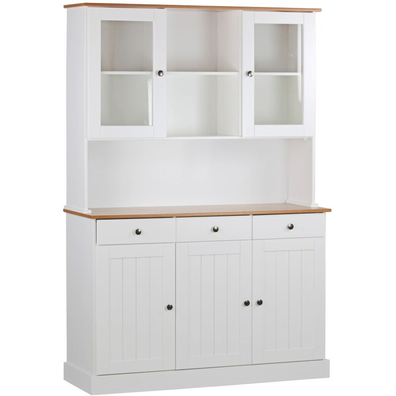 Credenza Credenza con vetrinetta 5 ante e 3 cassetti 128x197 cm 128,4x43x197 cm in legno bianco/noce La credenza a 5 sportelli Provenza e 3 cassetti abbina fascino campagnolo e prezzo accessibile per la tua cucina. Questo mobile portatutto è suddiviso in una parte alta con ripiani e ante con vetri e in una parte bassa con tre cassetti e 3 sportelli. La solida struttura in legno massello di pino consente di riporre le tue stoviglie e la biancheria da tavola. La finitura bianca e l'abbinamento tra materiali diversi come vetro e legno, porterà un tocco di freschezza nella tua casa. Ideale per la cucina, il soggiorno o la sala da pranzo. Caratteristiche Tecniche Materiale: Legno massello e vetro Dimensione: (LxPxA): 128,4x43x197 cm Ampio piano d'appoggio per microonde, tostapane o altri elettrodomestici Stile: shabby / country Telaio robusto e piano d'appoggio in legno massello Colore: bianco con top in legno naturale