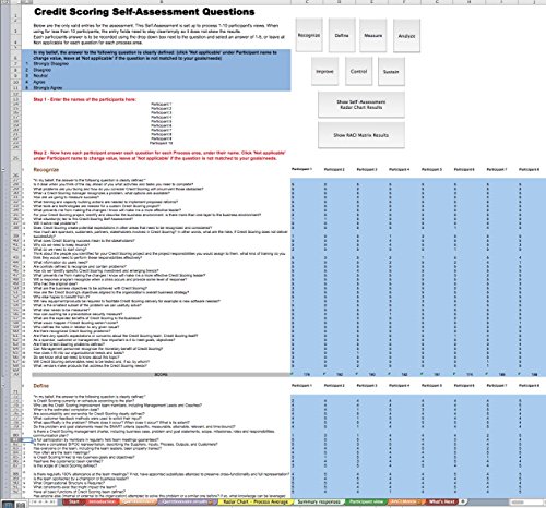 Credit Scoring Self-Assessment ensures you don't miss anything: More than 620 critical Credit Scoring success criteria in 7 RDMAICS (Recognize, Define, Measure, Analyze, Improve, Control and Sustain) steps with easy and quick navigating and answering for one or multiple participants