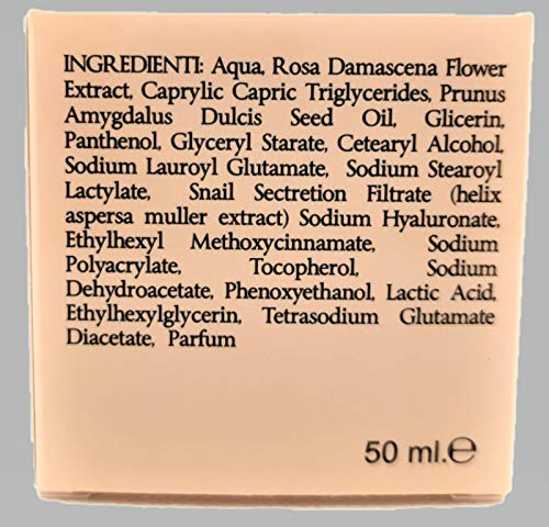 Principi attivi:Estratto di bava di lumaca PURA 100%, Glicerolo, Pantenolo, Arginina, Acido Ialuronico, idrolato di rosa damascena, vitamina E, l'olio di mandorle dolci