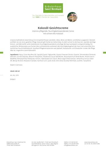Crema per il viso all'olio di cocco intensamente nutriente, idratante, con vero olio di cocco biologico, contenuto 100 ml