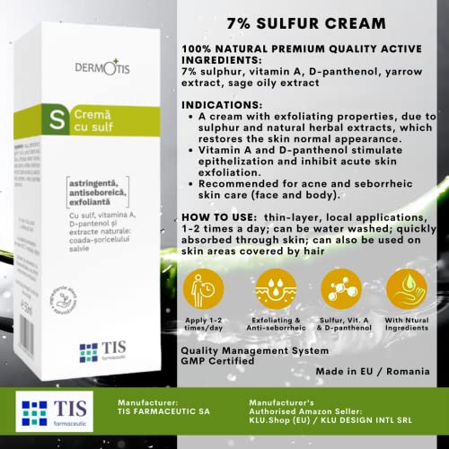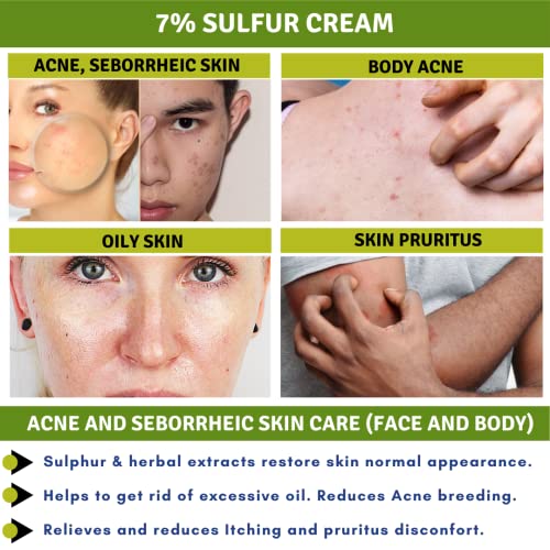 TRATATE LA VOSTRA ACNE CON ZOLFO - Con proprietà esfolitanti, grazie allo zolfo e agli estratti di erbe naturali, la crema ripristina l'aspetto normale della pelle. Aiuta a rimuovere sporco, olio, impurità e sebo in eccesso dalla pelle. aiuta la pelle a liberarsi dell'acne più rapidamente. Sblocca i pori, guarendo l'acne. Usare per trattare l'acne, la rosacea, la dermatite seborroica e l'eczema