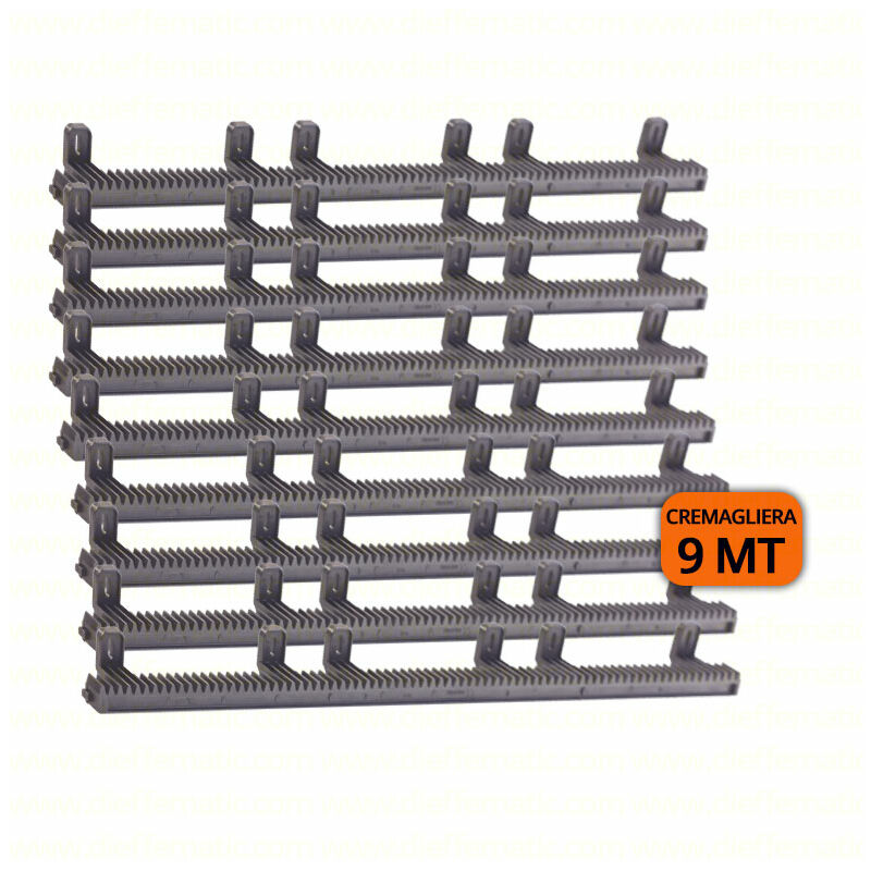 KIT 9 MT CREMAGLIERA UNIVERSALE ANTIUSURA IN NYLON PER CANCELLO SCORREVOLE + VITI DI FISSAGGIO SKU: 216/1-9MT Cremagliera per cancelli scorrevoli, lunghezza 1 Mt, con incastri a coda di rondine per effettuare il montaggio in successione. Composizione in nylon rinforzato con fibra di vetro e anima composta da un esagono di 8mm in acciaio che dona alla cremagliera resistenza e rettilineità. E composta di 6 attacchi fissi e modulo del dente standard M4. Modulo 4 Altezza 27.5 mm Profondità cremagliera 20 mm Profondità cremagliera con attacchi 40 mm Nella confezione con 6 viti 5.5x25 mm e 6 rondelle 6x32 mm per metro. Garanzia 24 mesi