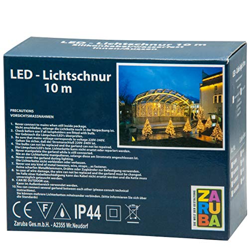 100 LED a luce bianca calda su un cavo lungo 10 metri per un'atmosfera accogliente.