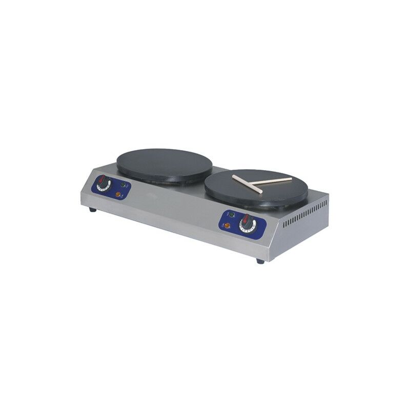 Codice RS0680 - Crepiera tonda doppia elettrica, modello ST-2223G, 400 volt, 3.0+3.0 kw, dimensioni cm. 77x42x19 (lxpxh), diametro piastre cm. 35+35 senza incavo perimetrale. Piatti in ghisa speciale lucida antiaderente. Interruttore bipolare. Lampada verde di rete. Lampade arancio per inserimento resistenze. Termostato di regolazione fino a 300 °C.