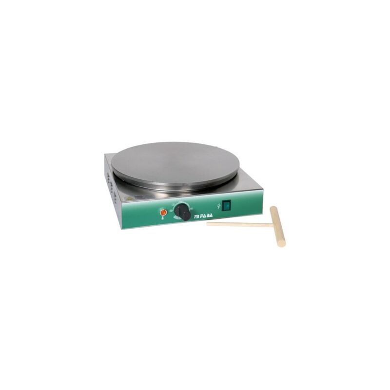 Codice RS3535 - Crepiera tonda elettrica, modello FF-S35-SA, 230 volt, 2.0 kw, dimensioni cm. 35x37x12 (lxpxh), diametro piastra cm. 35 senza incavo perimetrale. Struttura in acciaio inox. Piano di cottura in ghisa idonea per alimenti. Dotata di termostato per la regolazione della temperatura e termostato di sicurezza.