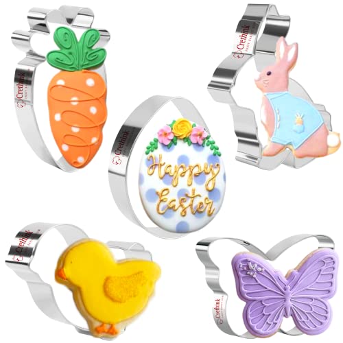 Crethink Formine per biscotti pasquali - Formine per biscotti pasquali, coniglietti, pulcini, carote, farfalle, formine per biscotti pasquali, 5 pezzi in acciaio inox per Pasqua e bambini.