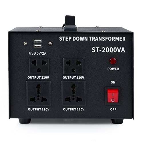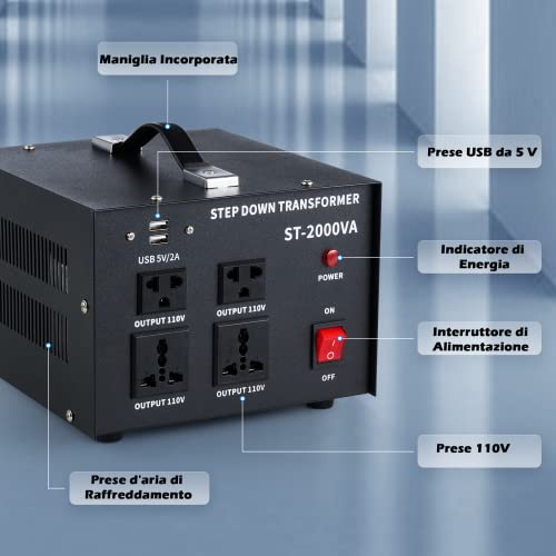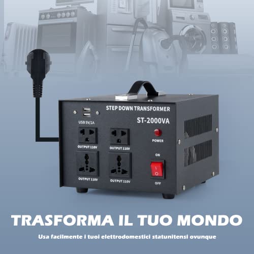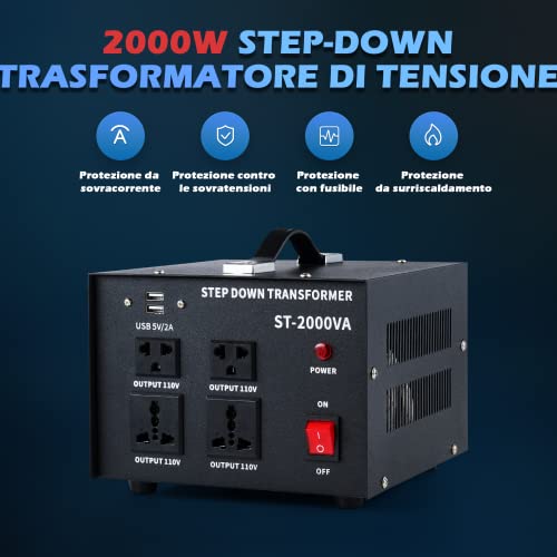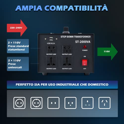 CREWORKS 2000W Trasformatore Step-Down Convertitore di Tensione da 240 230 220V a 110V Trasformatore Adattatore Spina da EU a US con 110V US e Prese Universali e Porte USB