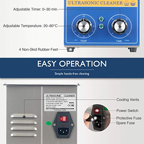 60W CAVITAZIONE ULTRASONICA: Questo pulitore ad ultrasuoni industriale utilizza 60 W di potenza per riempire il serbatoio 1,3 L con bolle di cavitazione, utilizzando la forza delle loro piccole implosioni per pulire accuratamente e professionalmente anche le superfici piccole e intricate;