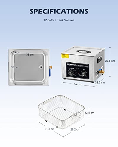 CREWORKS 15L Pulitore ad Ultrasuoni con Riscaldatore e Timer 360W Lavatrice ad Ultrasuoni Industriale in Acciaio Inossidabile per Casa e Laboratorio Professionale per Gioielli Occhiali Orologi