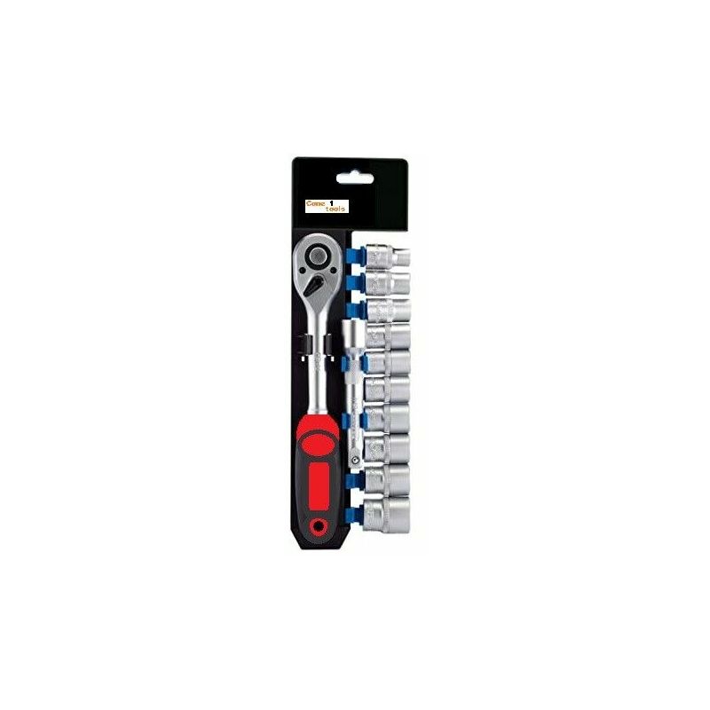 SET 12 PZ CRICCHETTO E BUSSOLE 'CONE TOOLS' Kit composto da 12 pezzi: - 1x cricchetto da 1/2 - 1x prolunda da 1/2 - 10x bussole da 1/2 ( 8 - 10 - 11 - 12 - 13 - 14 - 15 - 17 - 19 - 20 mm) Fornite su supporto in plastica (come da foto). Caratteristiche Attacco: 1/2 Contenuto: 12 pezzi Impugnatura in gomma Fornito con supporto