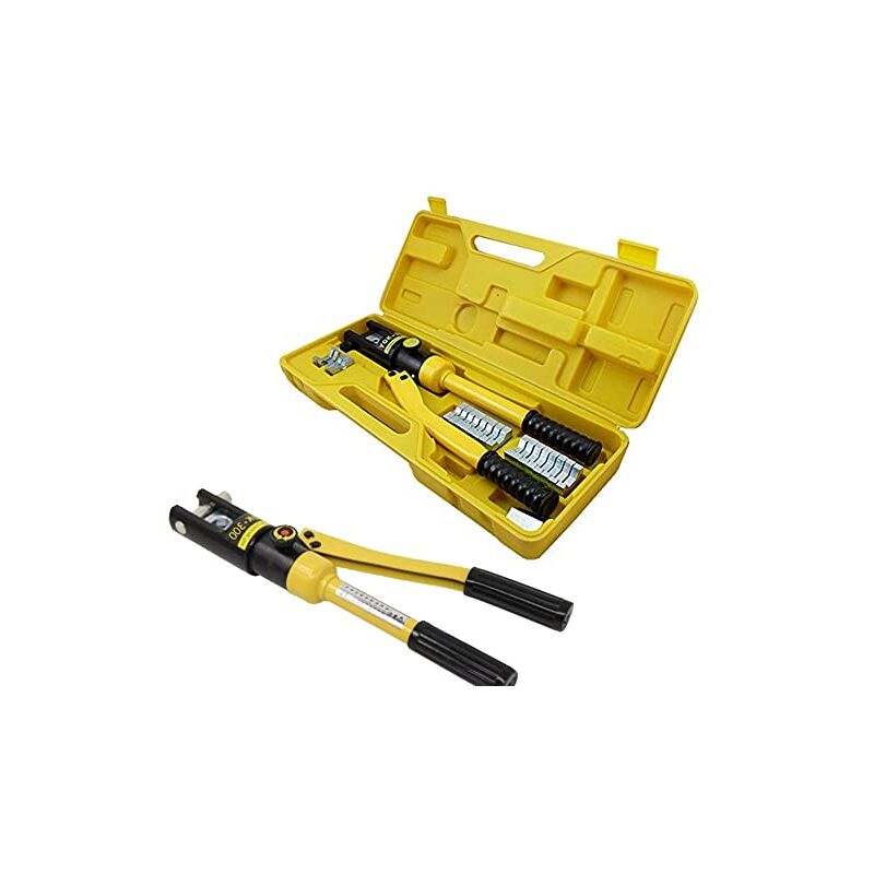 Pinza a crimpare idraulica - Questa pinza idraulica utilizza supporti in acciaio temprato della massima qualità, sufficientemente rigidi da aumentare la durata. 【Facile da usare】 L'impugnatura con una lunghezza di 25 cm sfrutta meglio il principio della leva ed è più semplice da usare. La maniglia isolata e antiscivolo lo rende più sicuro da usare. 【Alta qualità】 Efficace per tutte le ganasce da 10 a 300 mm², con una pressione massima di 12 tonnellate. 【Facile da usare】 Profili di punzonatura esagonali, matrici di crimpatura includono: 10, 16, 25, 35, 70, 95, 120, 150, 185, 240 e 300 mm². Ha una vasta gamma di applicazioni e una testa rotante a 360°, che è più comoda da usare. [Ampia gamma di usi] Le batterie, i cavi di saldatura e i cavi di alimentazione funzionano bene. È possibile utilizzare l'energia elettrica, le telecomunicazioni, i trasporti, il petrolio, l'estrazione mineraria, la metallurgia e altri campi. Pinza a crimpare NAIZY 10-300 mm² Pinza a pressare idraulica Pinza a