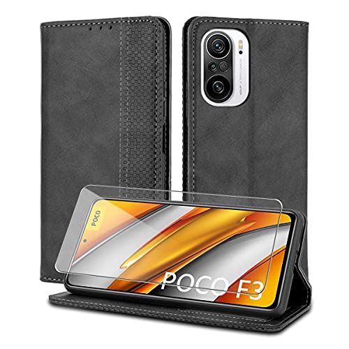Crisnat Cover per Xiaomi Poco F3 5G, Nero PU Pelle Libretto Flip Protettiva Custodia con Uno Vetro Temperato Pellicola Protettiva per Xiaomi Poco F3 5G 6.67"