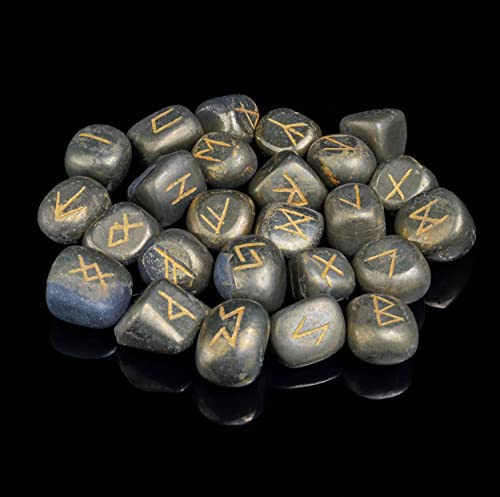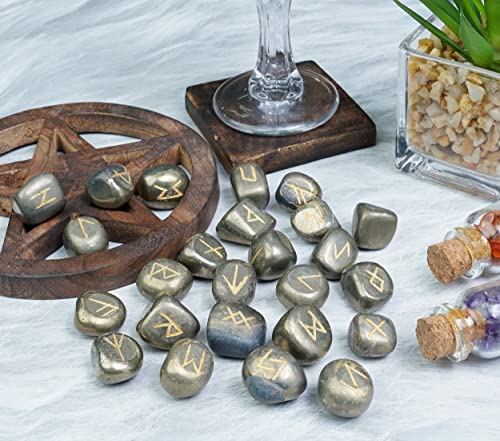 ✨ Set di rune di pietre preziose: pietre runiche di cristallo di pirite d'oro Set di 25 pietre, di cui 24 pietre con alfabeto runico inciso con lettere dorate e una pietra vuota viene fornito con una custodia e un opuscolo che spiega i simboli delle rune. Dimensioni: 15-20 mm