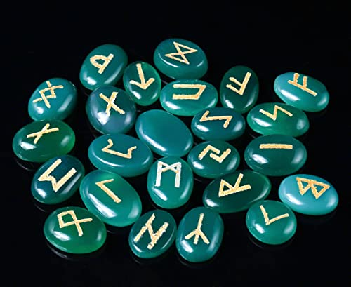Crocon Green Onyx Stone Pietre runiche Fatte a Mano con Alfabeto Futhark inciso Set di 25 Pezzi di Rune per Principianti Guarigione Reiki con Una Borsa e Una Runa Brochure Pietre runiche vichinghe