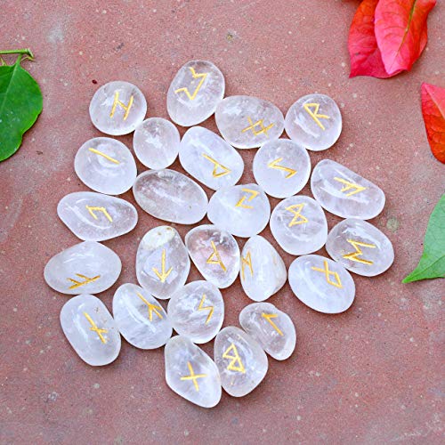 Crocon Set di Pietre runiche incise con Pietre preziose in Quarzo Trasparente (25 Pezzi) con alfabeti Futhark Elder e 1 Pendolo in Quarzo Trasparente Dimensioni: 15-20 mm