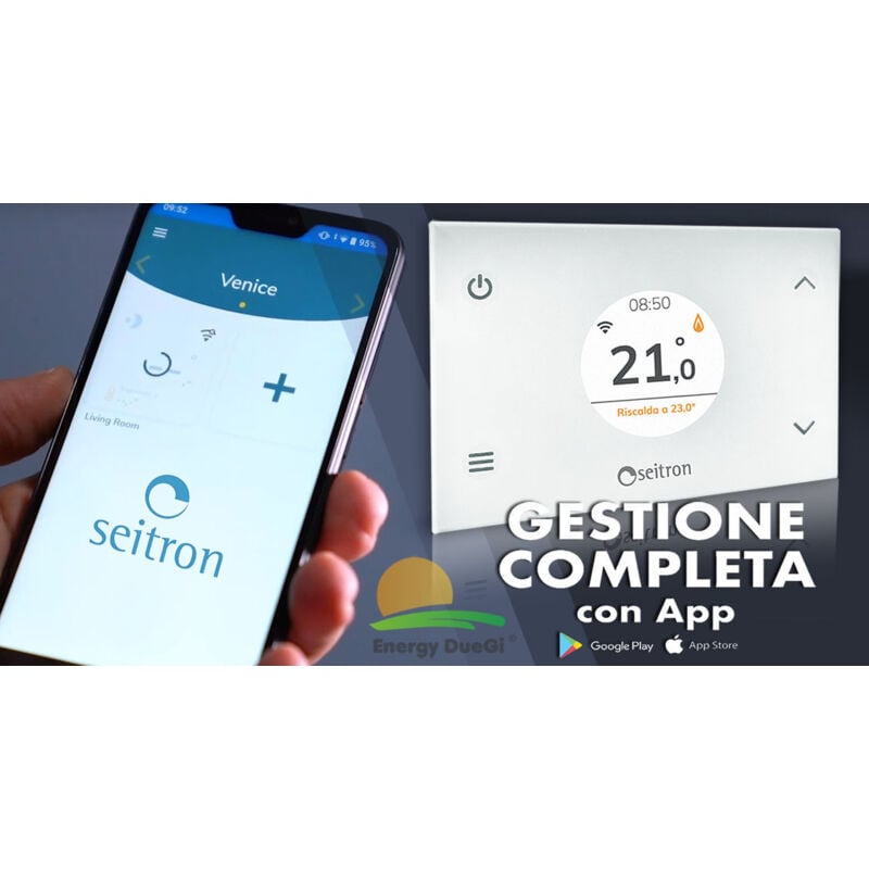 Cronotermostato da semi incasso WiFi Seitron WI-Time Novità in casa Seitron Wi-Time è un cronotermostato WiFi da semincasso, programmabile da Smartphone tramite App e alimentato da rete elettrica, con la possibilità di collegare una sonda remota (opzionale).E' caratterizzato da un display LCD circolare e da quattro pulsanti touch Tipologia: Cronotermostato da semi incasso Colori disponibili: Nero o Bianco Display: TFT a colori Alimentazione: 100..253Vac 50..60Hz Potenza assorbita inferiore a 2W Portata contatti relè: max 3A 250Vac SPDT WiFi: 802.11 b/g/n Gamma di regolazione: +5.0..+40.0 °C Gamma di misurazione: -10.0..+50.0 °C Modalità funzionamento riscaldamento/raffrescamento Programmazione settimanale o manuale Funzione Antigelo Modalità boost regolabile (30-60-90min) Possibilità di collegare una sonda remota Orologio con batteria tampone regolato dal web Grado di Protezione: IP 30 Dimensioni: 122x82x15 mm