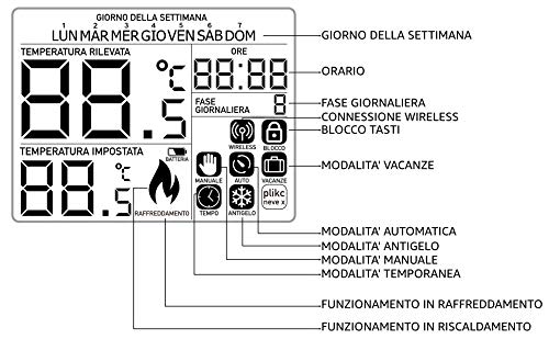 Cronotermostato wireless da parete o da tavolo alimentato a batterie 2x1, 5V AA (non incluse) + Unità ricevente alimentata a 230Vac - Nuovo modello 2020/2021: display completamente ridisegnato in italiano, nuove icone di funzionamento più chiare ed intuitive, su segnalazione dei nostri clienti abbiamo migliorato notevolmente il display LCD, ora è visibile ad ogni altezza ed ad ogni angolazione - Pulsanti soft touch e retroilluminazione celeste