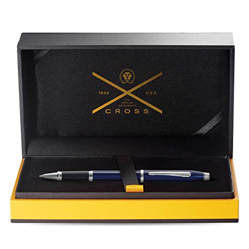 Questa elegante penna roller CROSS presenta una lacca blu traslucido con appuntamenti rodiati e si trova comodamente ed equilibrata nella mano