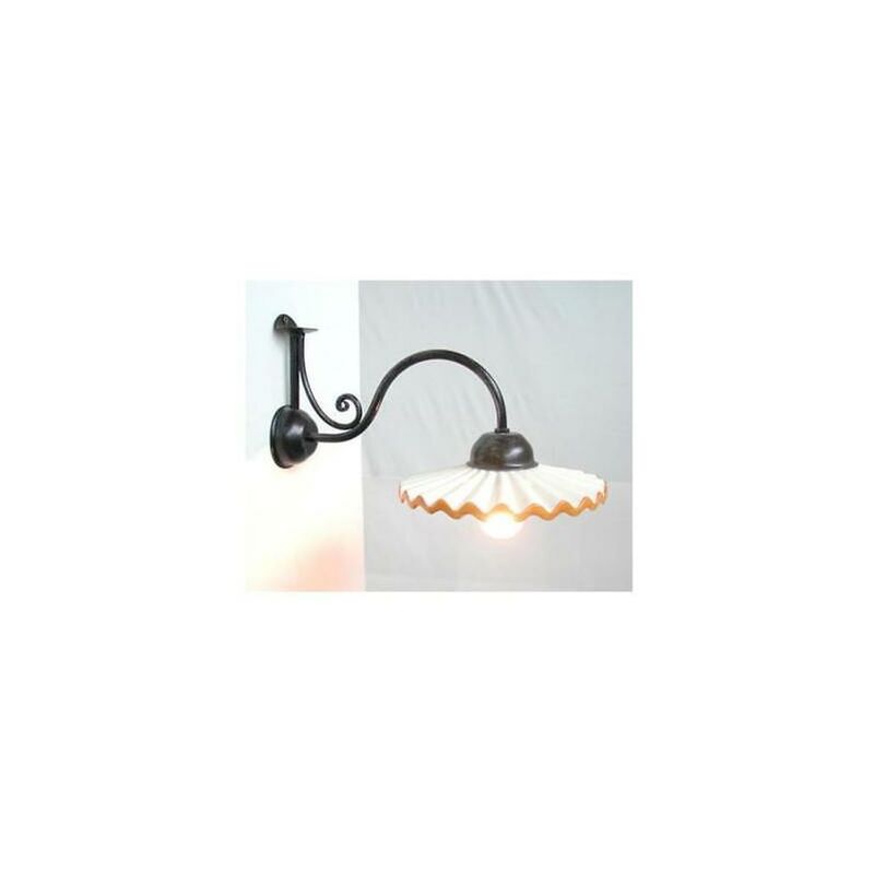 LANTERNA LAMPADA APPLIQUE PLAFONIERA VULCANO FERRO BATTUTO APPLIQUE 'VULCANO' Cruccolini Applique di ispirazione country chic con struttura in ferro battuto nero lavorata a mano e patinata argento. I paralumi sono in ceramica plissettata bianca con profili giallo ocra. Le lampade della linea ''Vulcano'' rendono la casa accogliente e luminosa, pensati per farvi sentire a vostro agio sia che viviate in campagna od in città. Da abbinare agli altri complementi della collezione. Dimensioni: Ø 20 x 34 ↗ x 18 ↑ cm Paralume: Ceramica bianca con profili dipinti a mano giallo ocra - Ø 20 cm Consiglio d'uso: Applique consigliata per arredare cucine e salotti, adatta sia ad ambienti minimal che non grazie alle linee pulite. 1 lampada E27 max 60 W - IP43 - Uso interno ed esterno - 220-240 V / 50 Hz - Lampadine escluse - Garanzia 5 anni