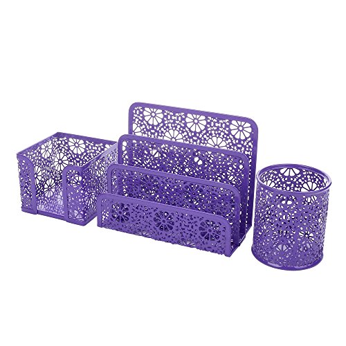 Crystalove, set di 3 portaoggetti (portapenne, portabigliettini e portalettere) in rete metallica, da scrivania di ufficio Purple 2